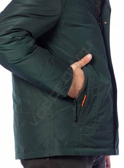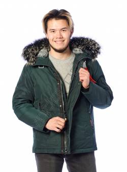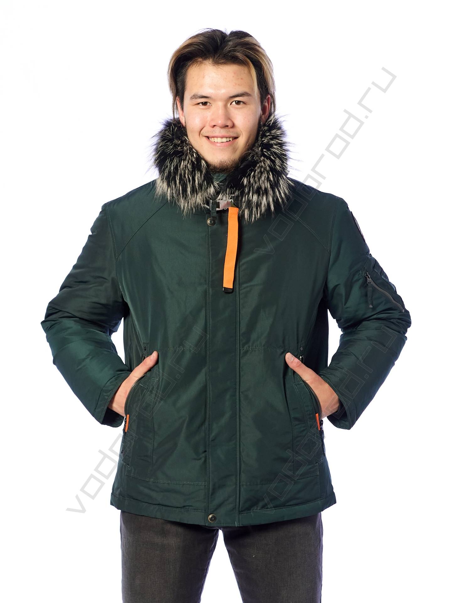 Мужская зимняя куртка, прямого кроя, длина до бедра, центральная молния с ветрозащитной планкой на кнопках, воротник стойка с внутренней отделкой из искусственного меха переходящий в несъемный регулируемый капюшон с отделкой из натурального меха - чернобурка (мех съемный), два боковых врезных кармана на молнии и кнопке, два внутренних кармана, на рукаве карман на молнии, внутренний трикотажный манжет.