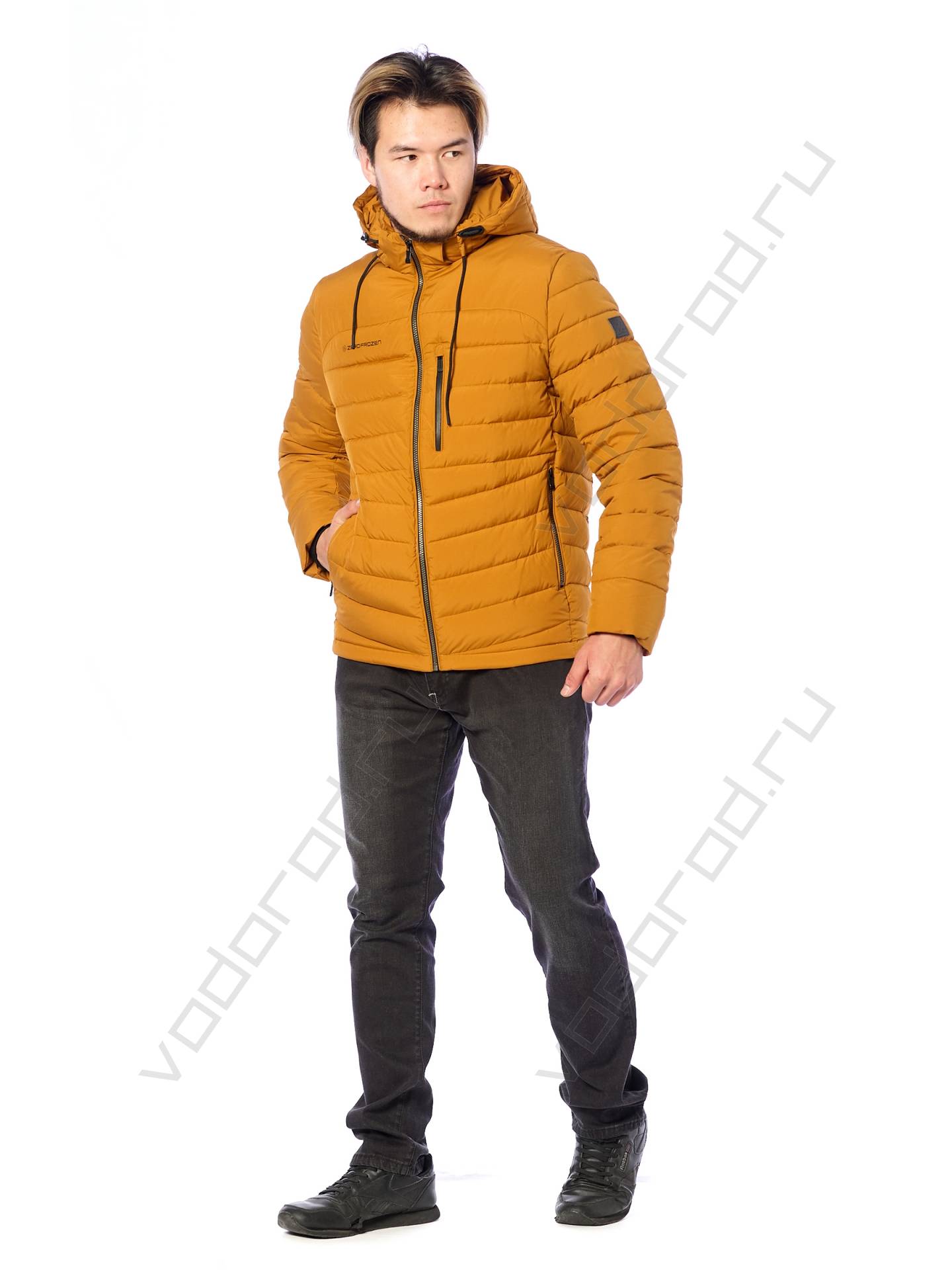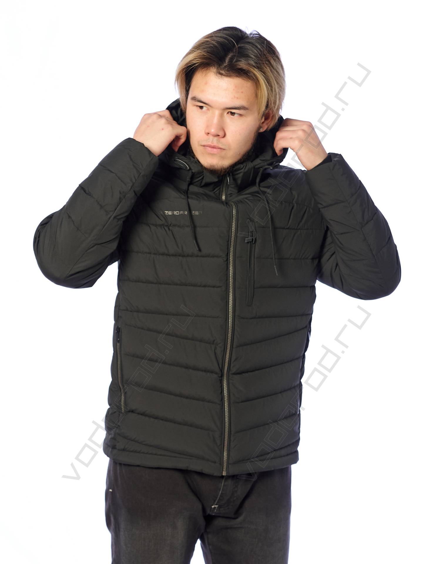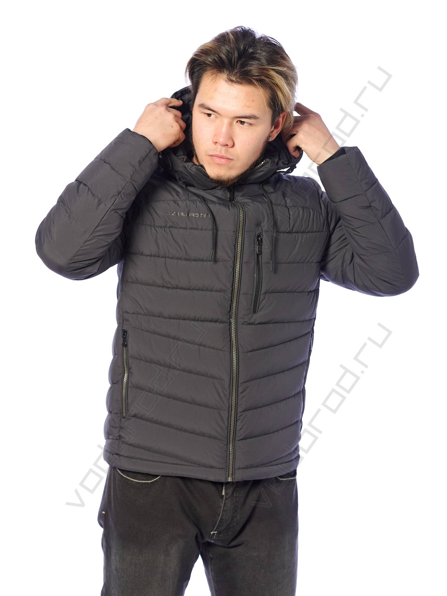 Мужская зимняя куртка, укороченная модель, центральная открытая молния, воротник стойка, съемный регулируемый капюшон, один нагрудный карман на скользящей молнии, два боковых врезных кармана на молнии, два внутренних кармана, внутренние трикотажные манжеты, брендированный накат на груди, низ куртки регулируется кулиской.