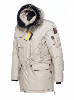 Куртка имеет центральную молнию с ветрозащитной планкой на кнопках, для защиты от холодных порывов ветра. Воротник стойка с отделкой из искусственного меха, переходящий в несъемный регулируемый капюшон с отделкой из натурального меха - чернобурка, мех съемный. Ворот регулируется фирменным съемный карабином со шлевкой.