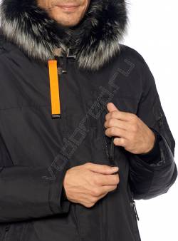 Куртка имеет воротник стойку с отделкой из искусственного меха, обеспечивая дополнительное тепло, переходящий в несъемный регулируемый капюшон с отделкой из натурального меха - чернобурка, мех съемный. Центральная молния с ветрозащитной планкой на кнопках, надежная защита от ветра и холода.